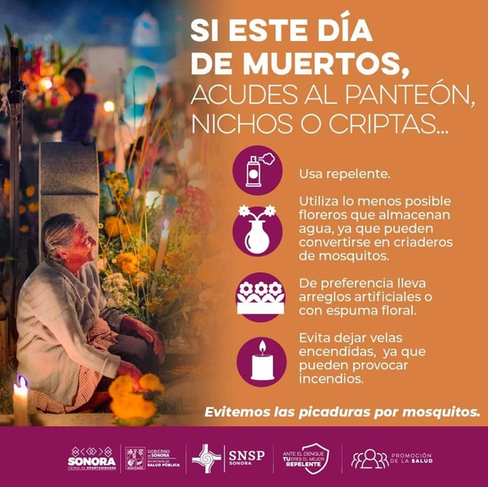 Hermosillo, Sonora; noviembre de 2025.- Con motivo de las festividades del Día de Muertos, el Gobierno de Sonora, a través de la Secretaría de Salud, hizo un llamado a la población para mantener medidas preventivas que eviten la proliferación del mosquito transmisor del dengue en los panteones del estado.