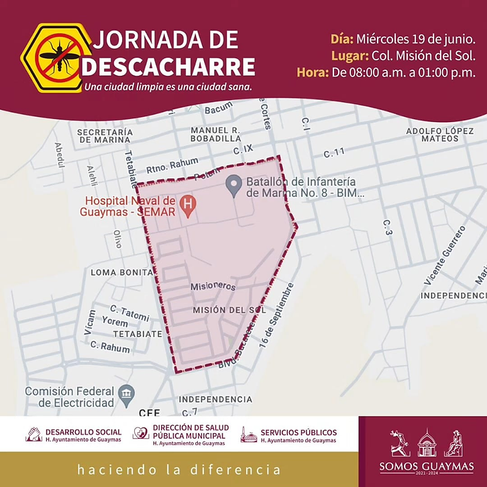 Guaymas, Sonora, 14 de junio de 2024.- En prevención a casos de dengue, zika y chikungunya, el Ayuntamiento de Guaymas a través de la Dirección de Salud Municipal, Desarrollo Social y Servicios Públicos, anuncia la siguiente ‘Jornada de Descacharre’ en el sector Palmas, Misión del Sol, Centinela y Tetabiate.